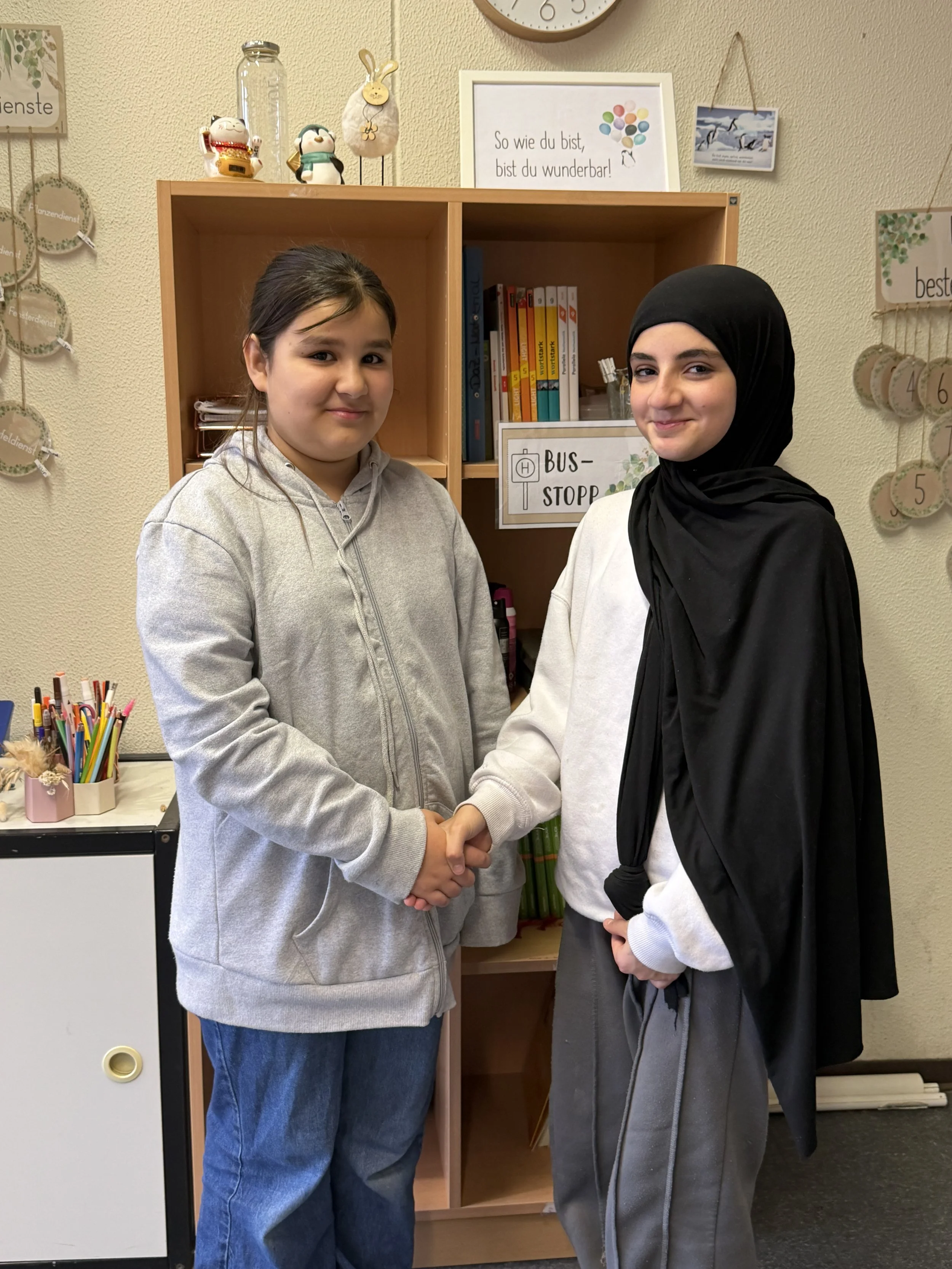 Wir wurden von der Schulsozialarbeit ausgebildet, euch in Konfliktsituationen zu unterstützen. Dort lernen wir, wie man Streit fair bespricht und wie man gut zuhört. Wir üben auch verschiedene Wege, wie man Konflikte ohne Ärger lösen kann.